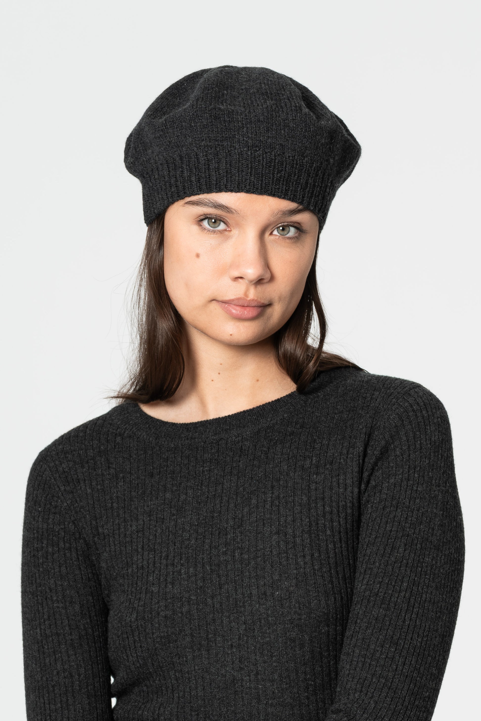 A plain knitted beret with ribbed edging. Hand knitted in extra fine merino wool.