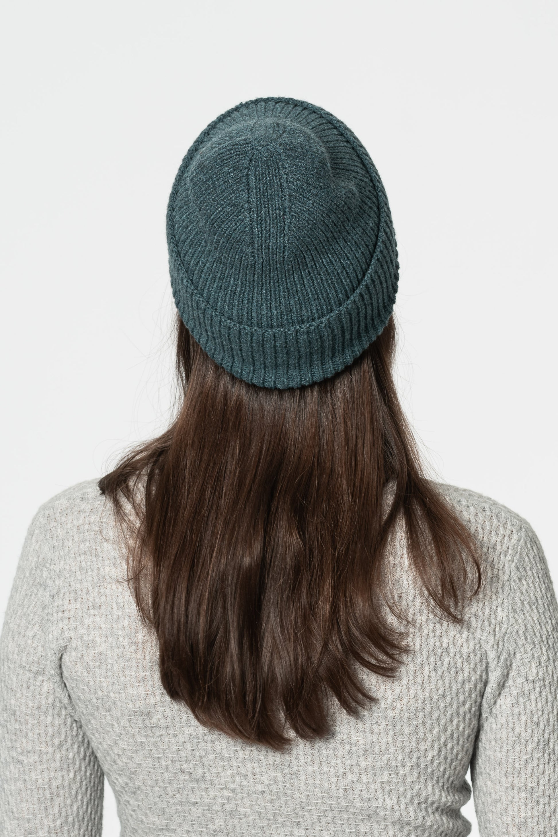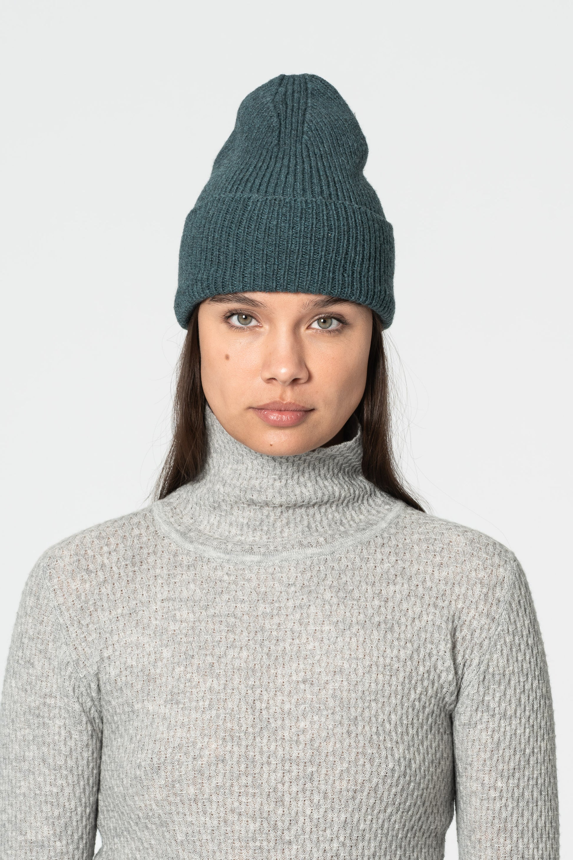 A rib knitted hat with a unique decrease detail on top. Hand knitted in extra fine merino wool.
