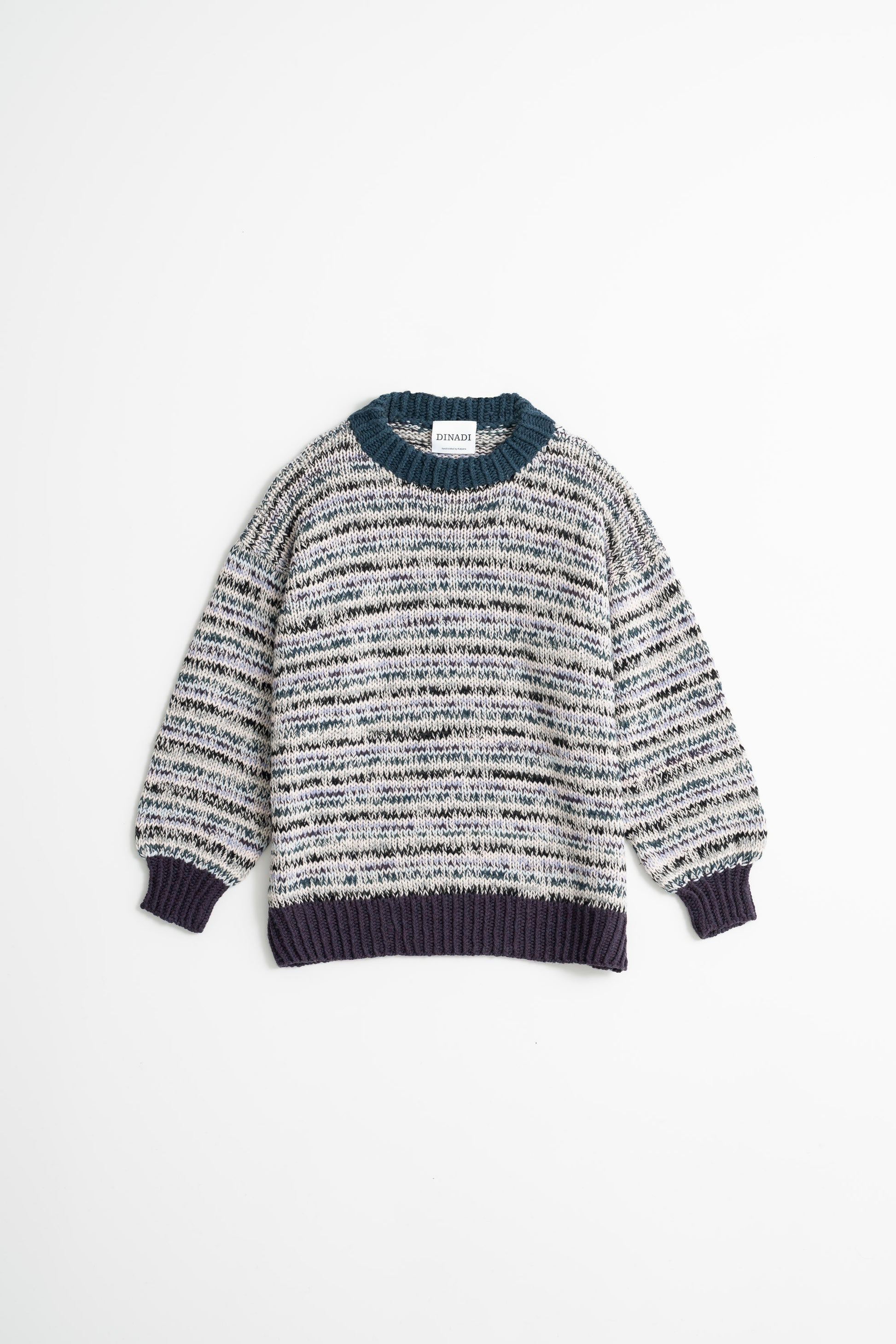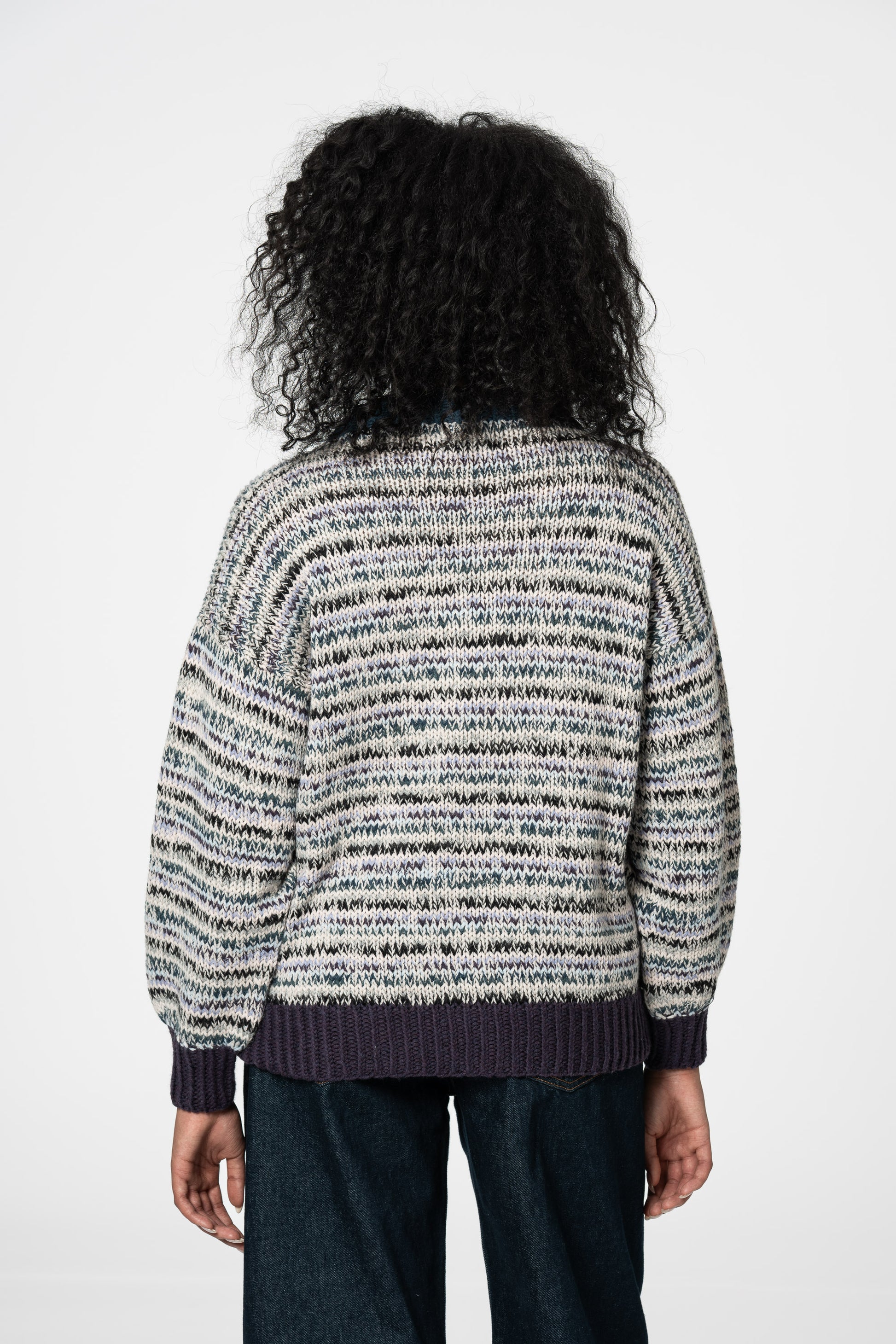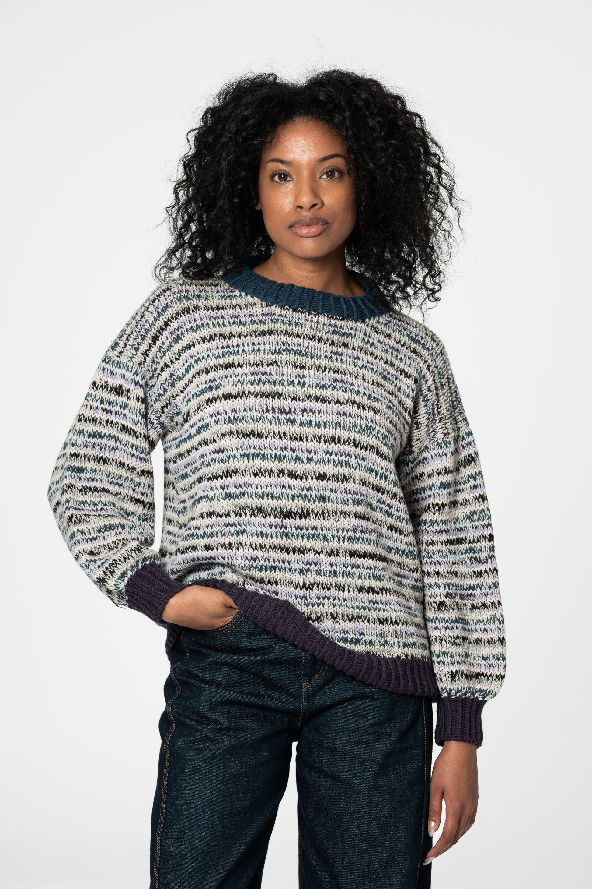 A planet friendly, hand knitted sweater made using 40% left over yarn scraps from production spill giving this sweater a splash of colour. It has loose sleeves and dropped shoulders. Hand knitted in extra fine merino wool.