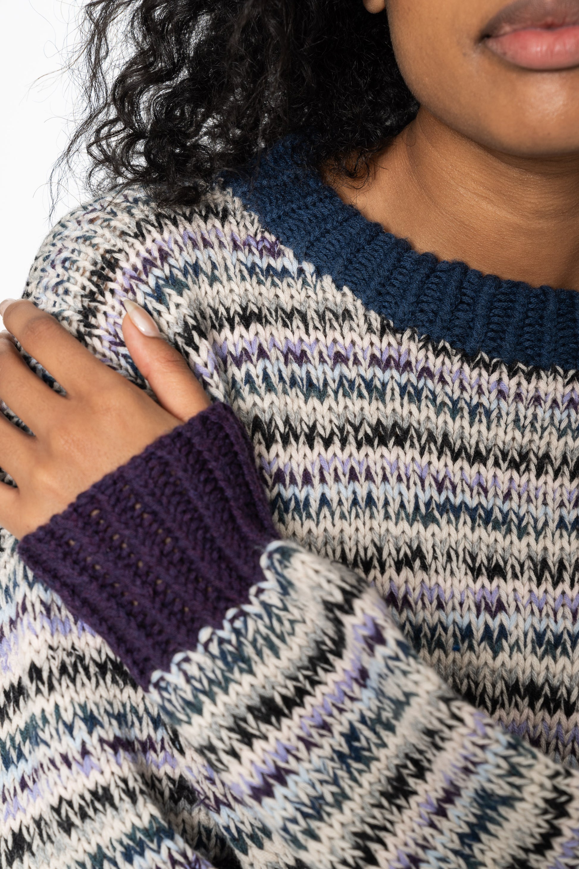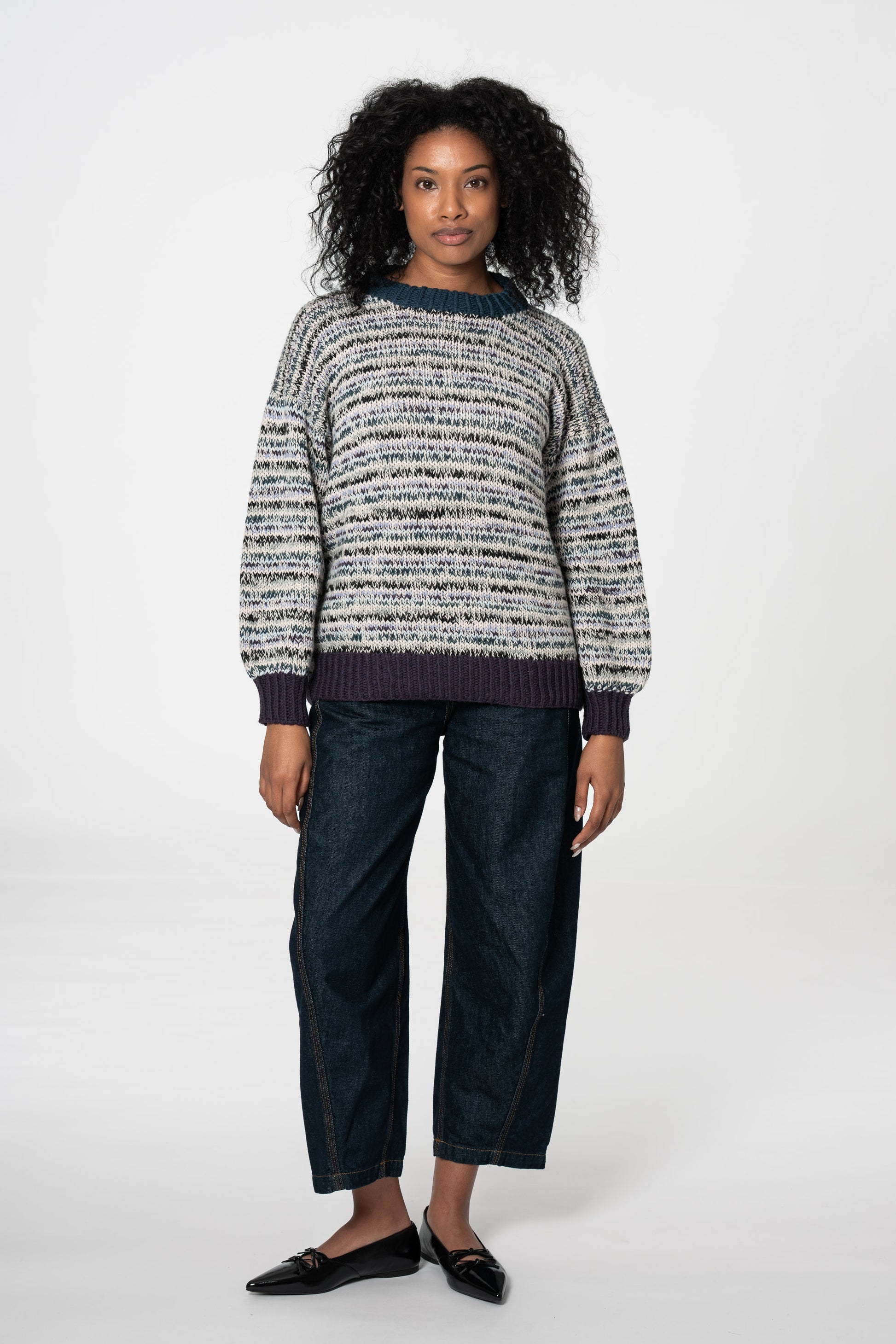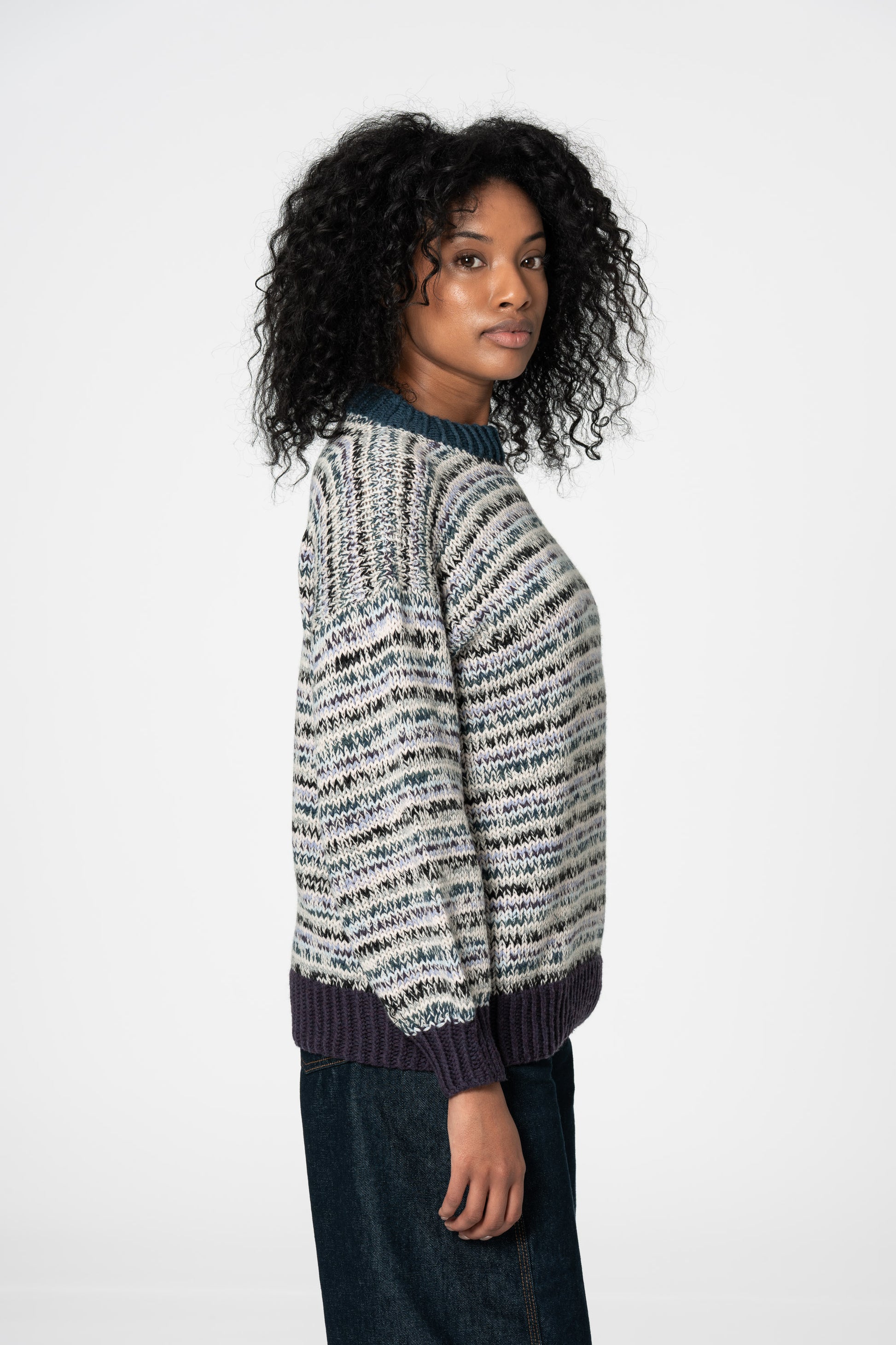A planet friendly, hand knitted sweater made using 40% left over yarn scraps from production spill giving this sweater a splash of colour. It has loose sleeves and dropped shoulders. Hand knitted in extra fine merino wool.