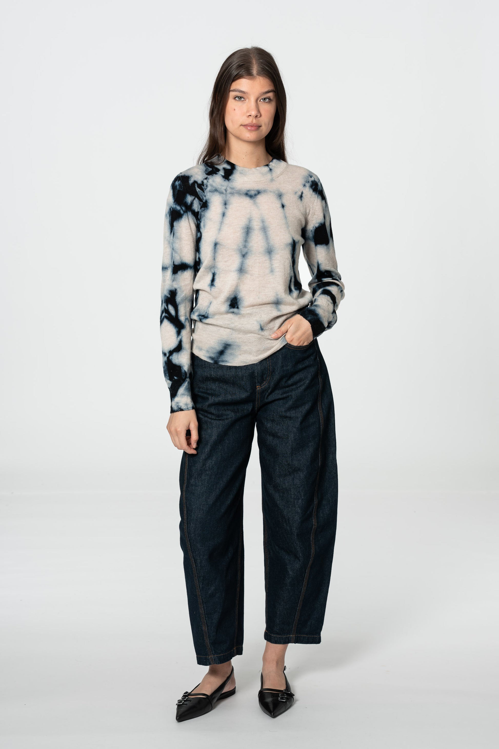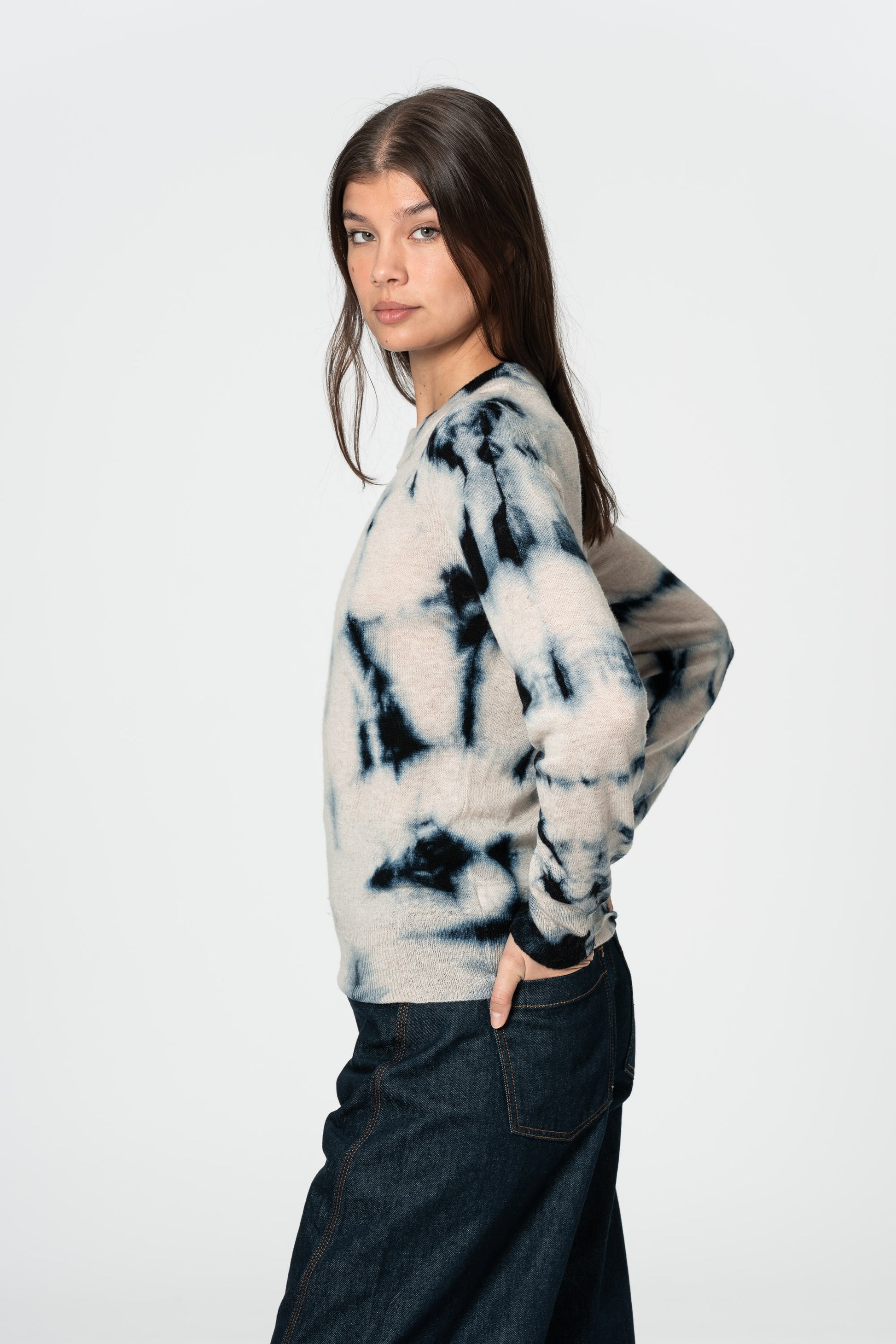 A round neck that has been hand dyed using a traditional Japanese dying technique, shibori, to create a unique pattern. Knitted in extra fine merino wool.