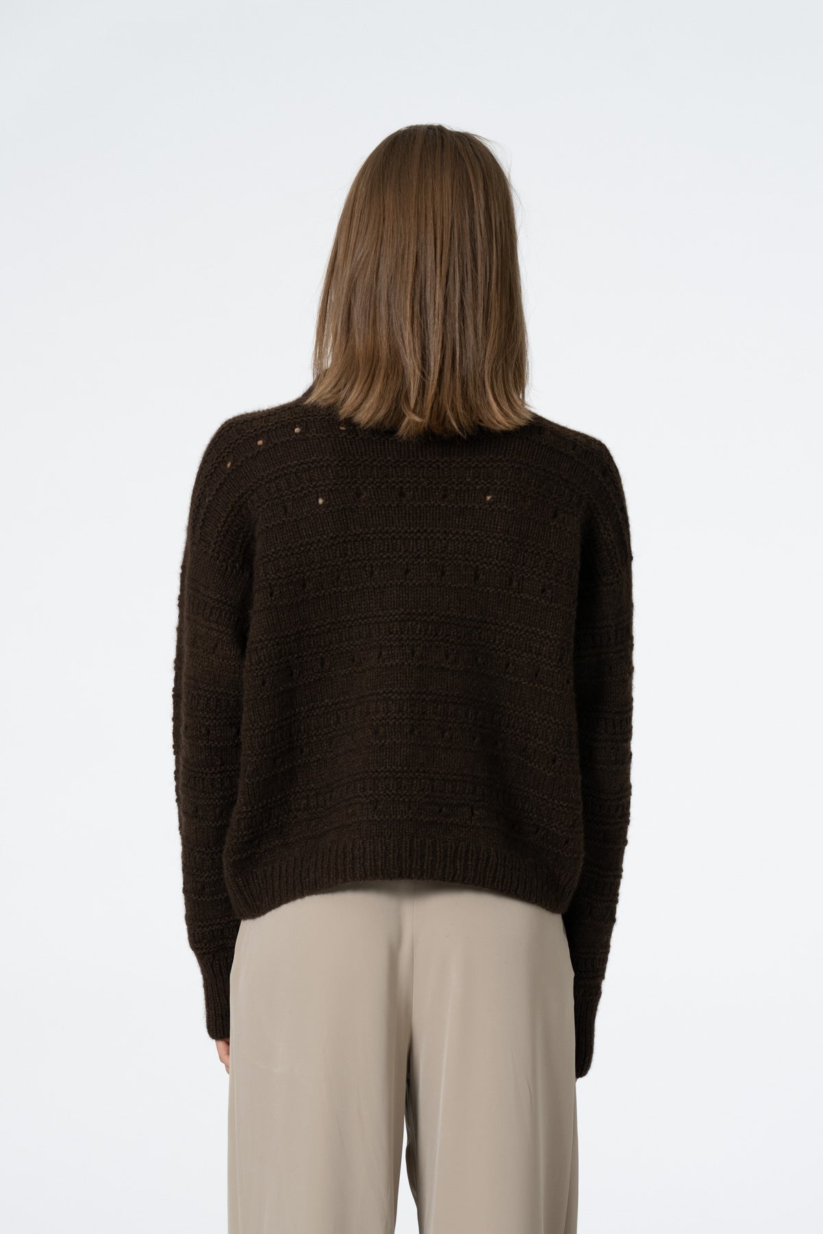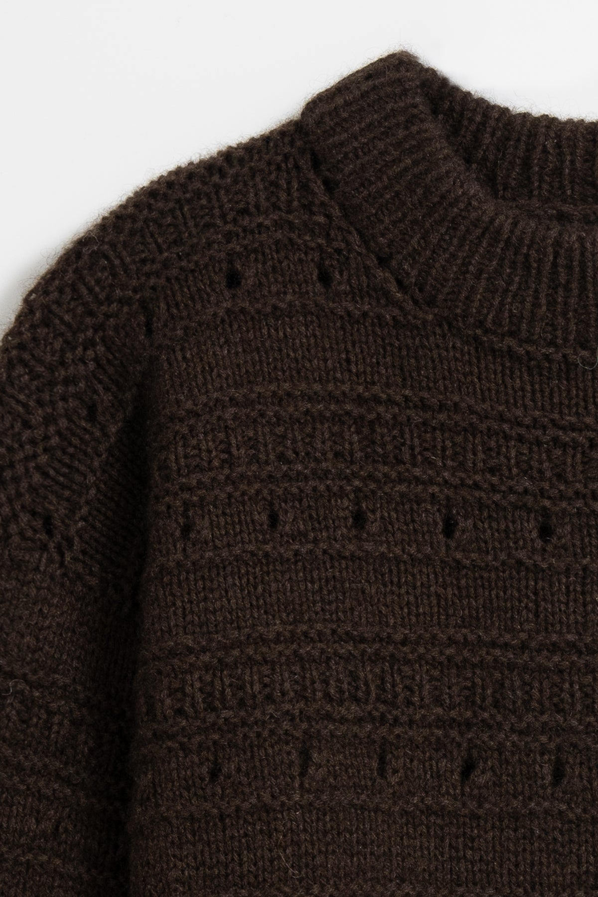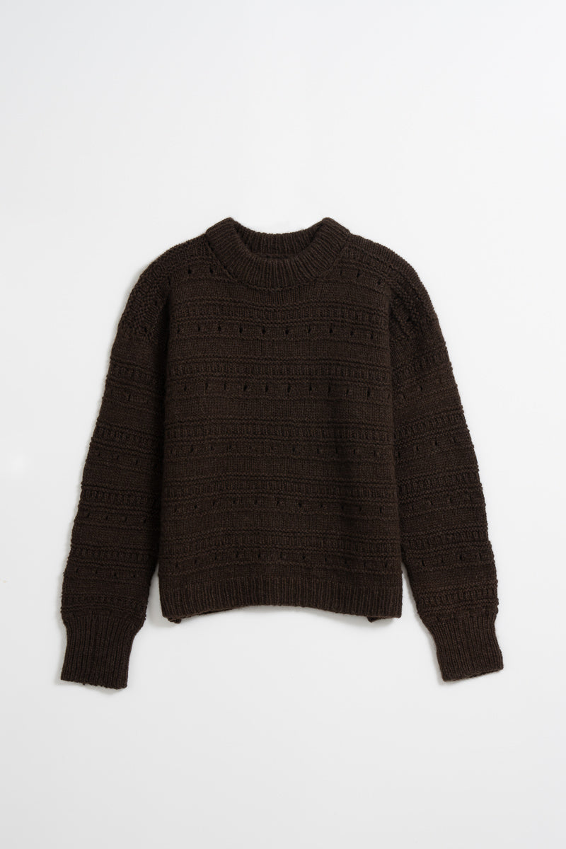A loose fitting hand knitted sweater with a unique striped pattern structure in knit and purl, rib and holes. It has wide sleeves with dropped shoulders. Hand knitted in undyed yak wool.