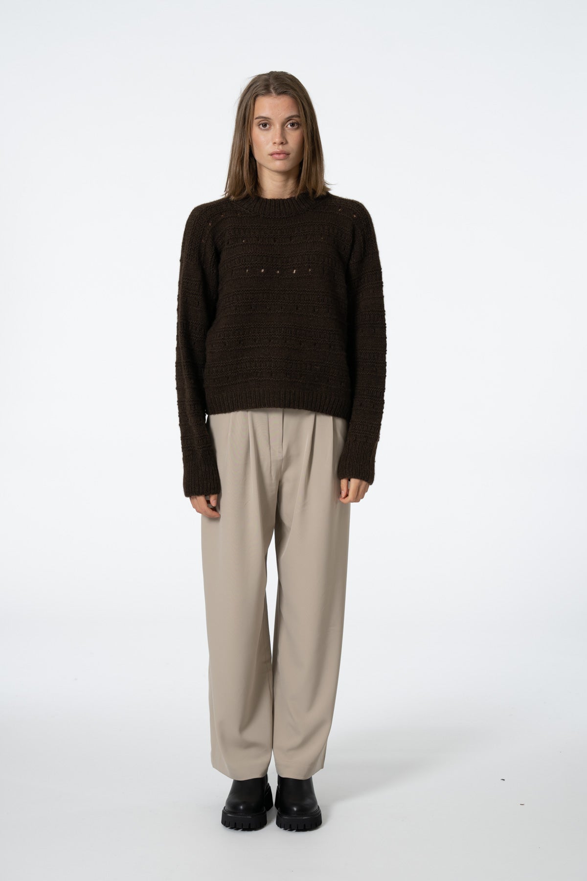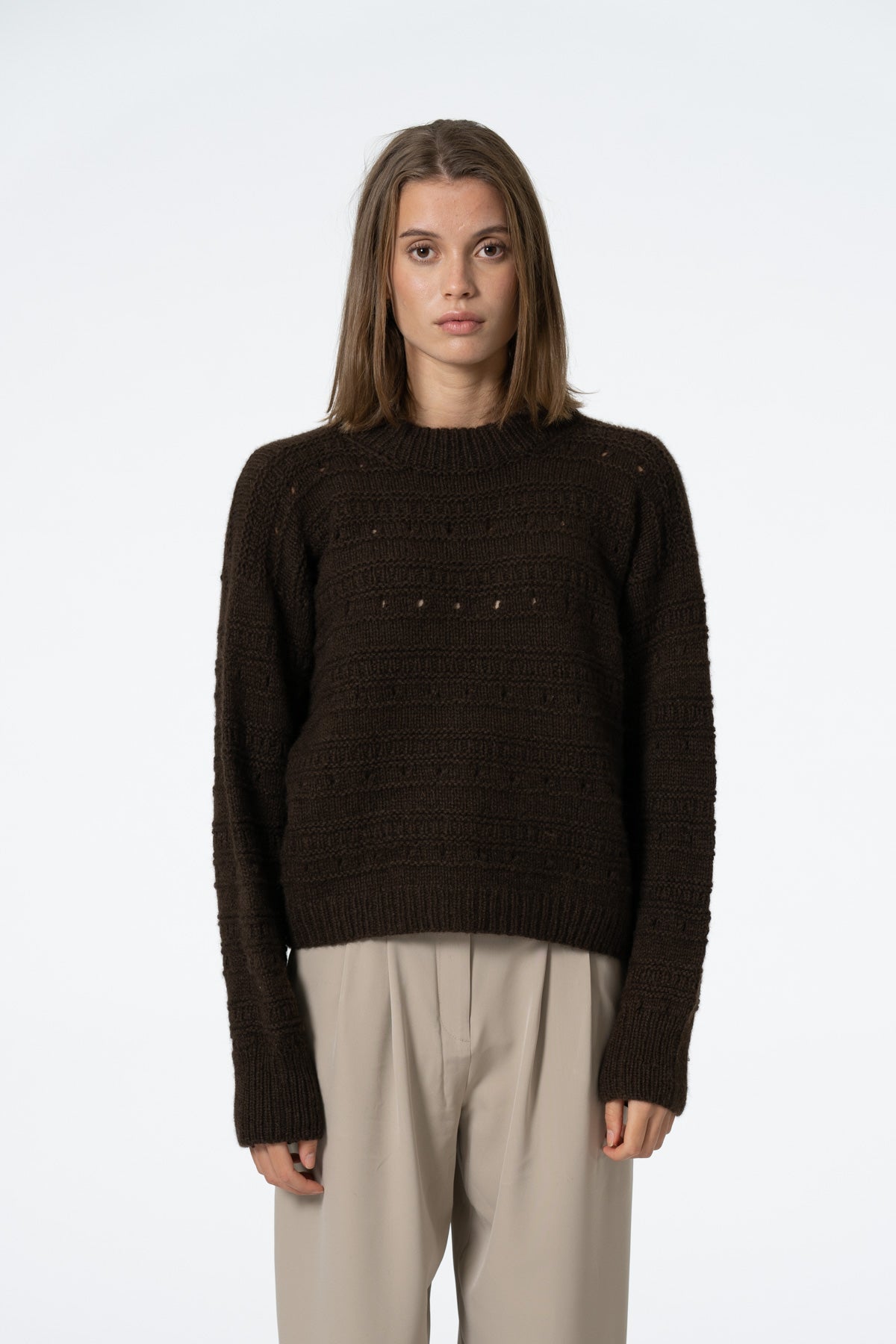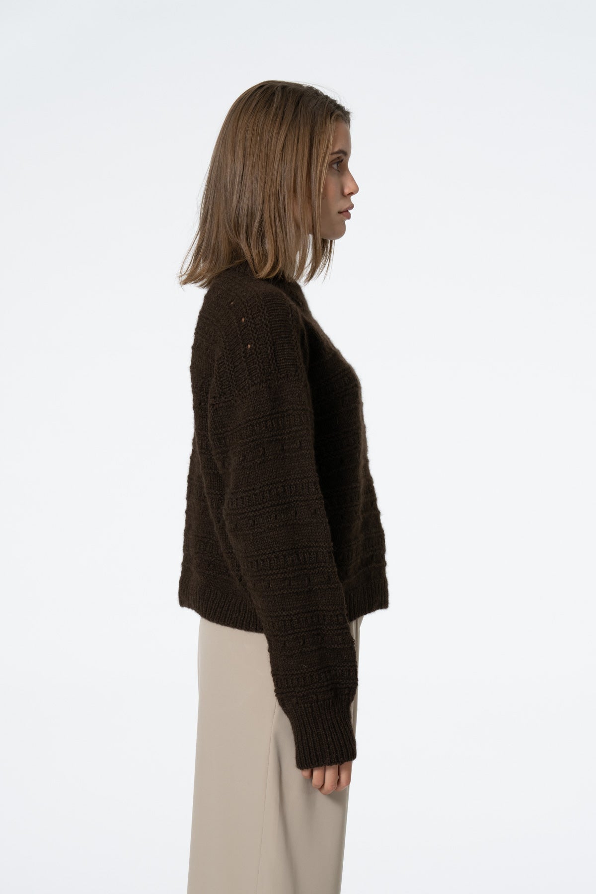 A loose fitting hand knitted sweater with a unique striped pattern structure in knit and purl, rib and holes. It has wide sleeves with dropped shoulders. Hand knitted in undyed yak wool.